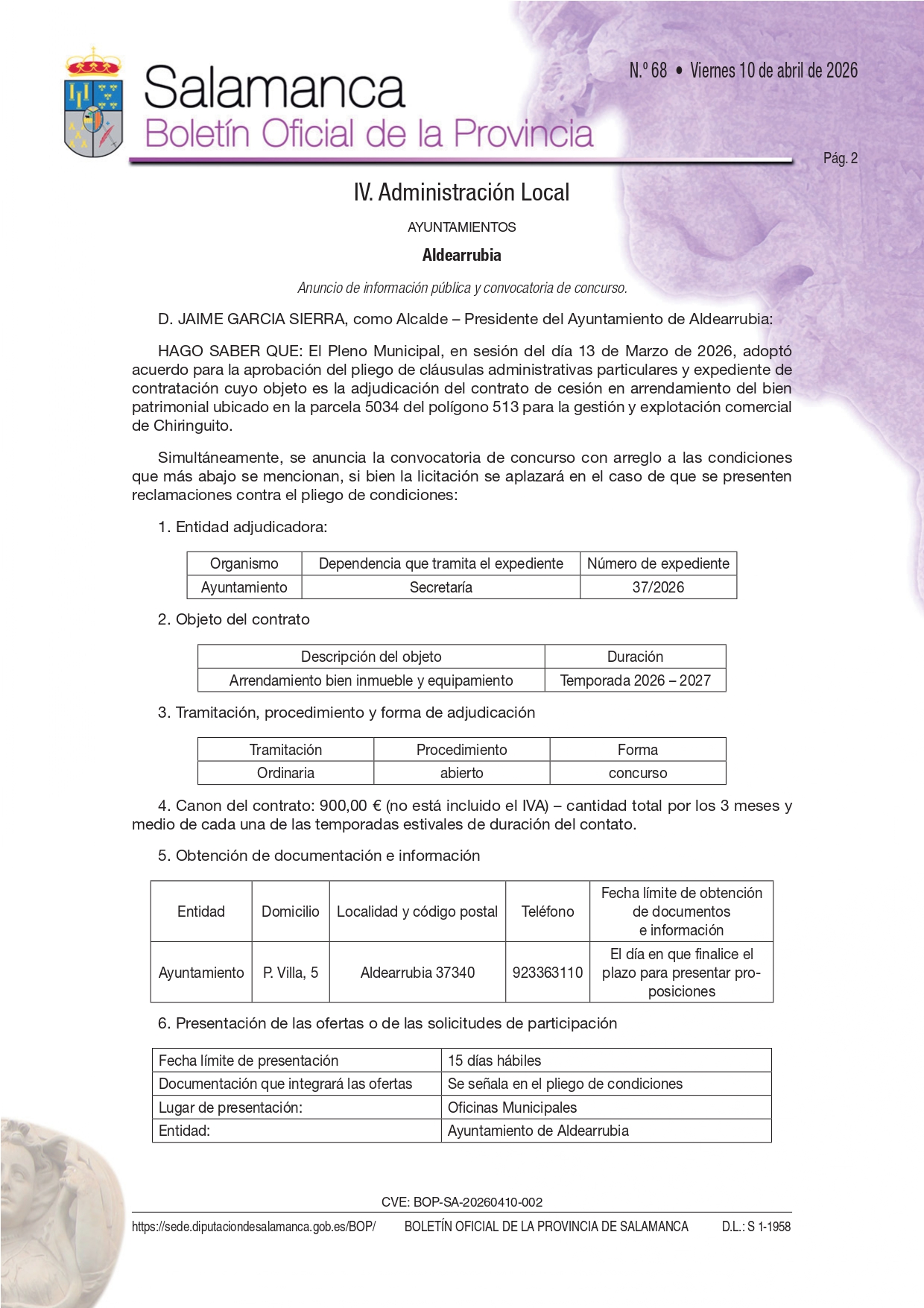 Plaza de la Villa, 5. 37340. Aldearrubia. Salamanca. Tel/Fax 923 363 110